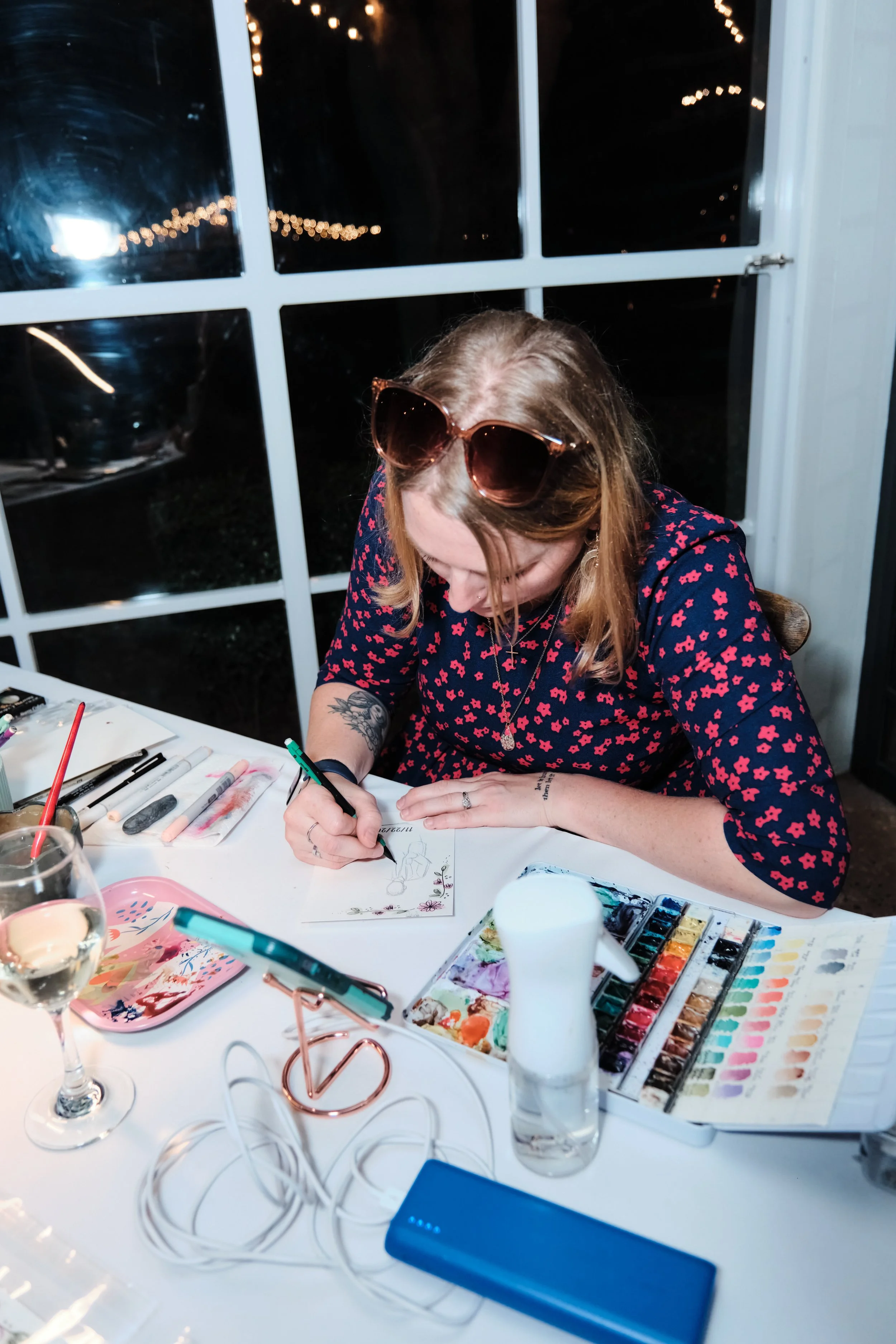 For guest wedding favors portraits, Nicole uses high quality watercolors and ink pens on mixed media paper. She sets her materials up in an area that allows her a good view of your event but towards the back as to not disrupt the ceremony. It's a great way for your guest to see the progress of their paintings and get some great interactions. All she requires is a table, chairs, and an electrical outlet.